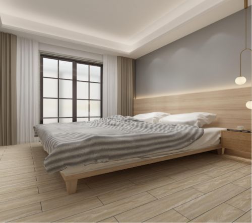 夏日房间搭配原木色木纹仿古砖,清晰细腻的木纹、古色古香的原木本色,将窗外的夏日自然美延伸、弥散在房间里,让你仿佛徜徉在大自然中,给人简洁舒适之感。