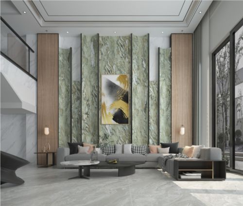 嫩绿色的岩板,逼真的纹理,宛如一块块晶莹剔透的碧玉,冰清感迎面扑来,将它折弯使用,加入金属条元素凹造型,宛如置身于一片茂盛的树林里,凉风习习,让整个夏日家居空间鲜活起来,清凉又惬意。