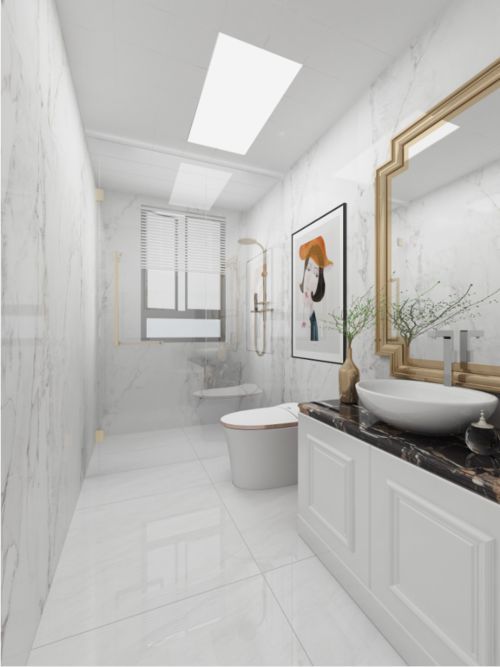 卡拉拉白抗菌砖,以纯净的白色为底色,在洁白的砖面细细勾勒出一道道纤巧的肌理,于浴室空间中大面积铺贴,打造一个浑然天成、干净整洁的空间,营造出夏天的舒心清爽感。