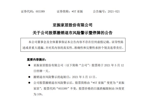 5月11日晚,*ST亚振(SH:603389)发布公告,公司股票于2021年5月12日停牌一天,5月13日起复牌并撤销退市风险预警,股票简称由“*ST亚振”变更为“亚振家居”,股票代码不变,股票价格的日涨跌幅限制由5%变更为10%。