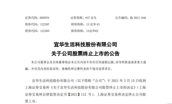 继航标控股之后,3月22日,*ST宜生(SH:600978)终止上市,成为家居行业第一家被证监会摘牌的企业。据搜狐焦点家居了解,公司股票已连续20个交易日(2021年1月19 日-2021年2月22日)收盘价格均低于股票面值(即1元),接连的下跌让企业不堪重负,最终只得选择停牌。