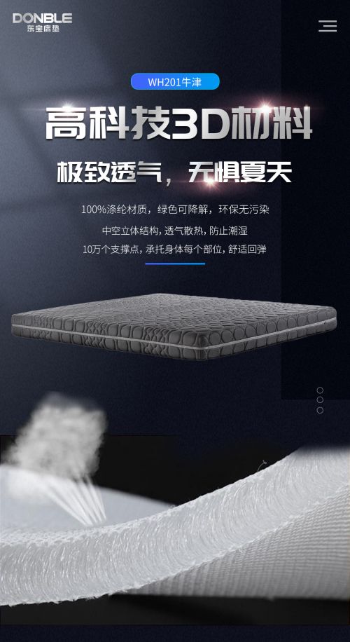 在众多床垫中,3D床垫的透气性最强,散热能力最好。东宝床垫“牛津”,内部采用高科技3D材料填充,360°透气让空气自由流通,快速散发热量,实现主动“降温”,非常适合在炎热的夏天使用。