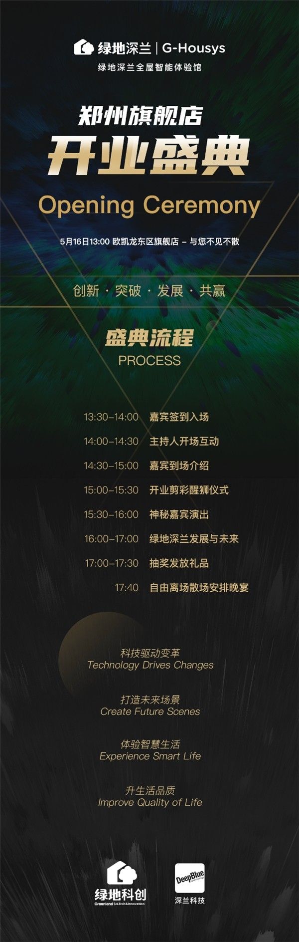2021年5月16日13:00,绿地深兰全屋智能体验馆郑州旗舰店将在商都路农业南路欧凯龙东区旗舰店负一楼西厅盛大开业。