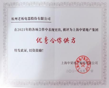 近日,中梁地产对优质供应商进行了表彰。老板电器连续五年作为中梁地产厨电国产高端类供应商,荣获“2021中梁地产优秀合作供方”荣誉。