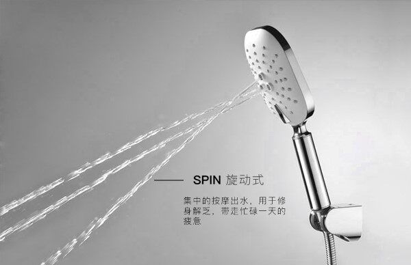 拿起手持花洒,SPIN创新旋动式和雨淋式两种水花随易拨动切换,绵密触感包裹娇嫩肌肤,多层次SPA体验,重焕机体活力。