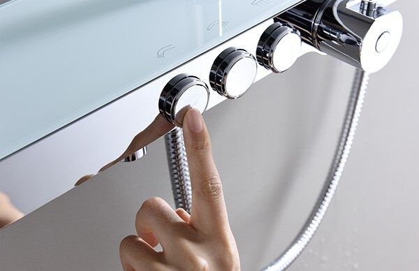 希尔恒温淋浴水龙头包含常规的款式,也包含十足现代感设计、融合按键以及安全钢化玻璃置物面的潮流款式。