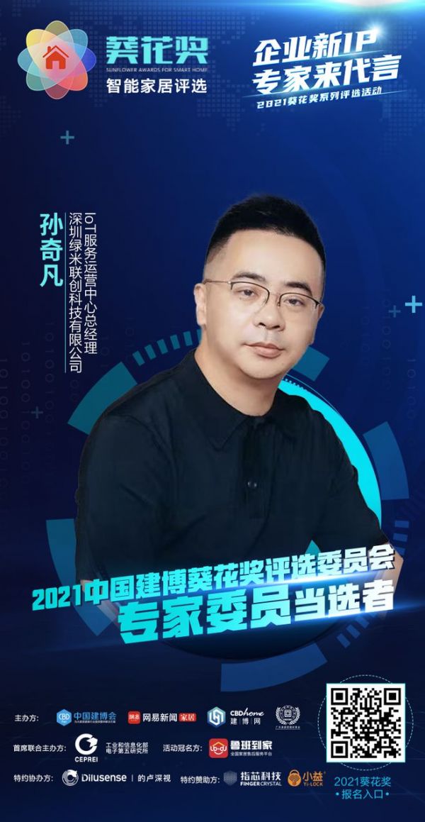 深圳绿米联创科技有限公司IoT服务运营中心总经理 孙奇凡 凭借自身专业的能力素养和过硬的技术本领,实力当选“2021中国建博葵花奖评选委员会专家委员”。