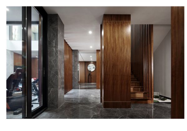 入户长廊的建筑感利落干净,选用简一大理石瓷砖阿波罗灰作为背景主色调,木质隔板做装饰,清晰明净的线条搭配自然采光,显得简约又大气,优雅而不失庄重,达到了以少胜多,以简胜繁的视觉效果。