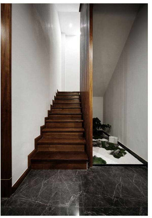 矮松探首,青苔点缀,这是一处自然空间。在高级灰与白色、现代简奢和古朴宁静中寻找着那一微妙的平衡,这也是这一处最大的一个特点,点到即止,没有过度的修饰,有的只是稍微的点缀。从踏上楼梯开始,就能够体会空间的性格:宁静致远,遗世独立。