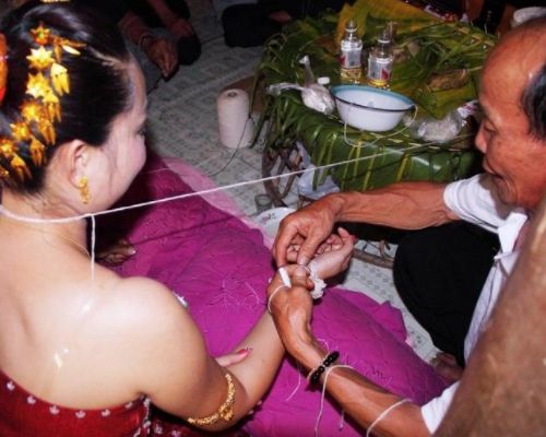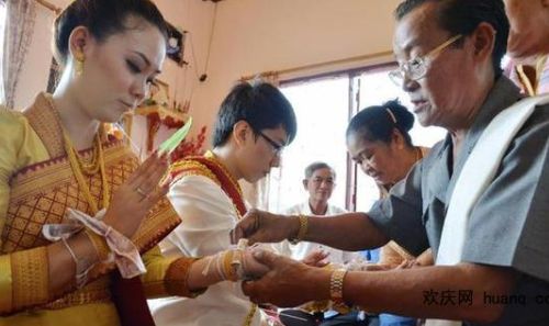 3、栓线仪式,是傣族结婚的一个重要项目。是在婚礼过程中,主持人用一根白线,从左到右地绕过新郎再绕过新娘的肩,然后把线的两头分别搭在婚桌上,意味着两位新人的灵魂已经被绑在一起了,从此之后,他们永不分离,白头到老。