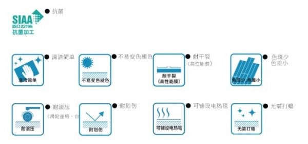 骊住一直致力于人们健康生活的居住环境,FA系列产品在设计之初就将安全性列为重点项之一。在FA系列产品设计时则采用SIAA(抗菌制品技术协会)认证的抗菌工艺。即在表面化妆膜中添加抗菌剂,能够使得地板表面具有抗菌技能,安心安全的抗菌仕样对于一般家庭存在的细菌,发挥抗菌性能,让生活的空间更健康,居住更加放心。