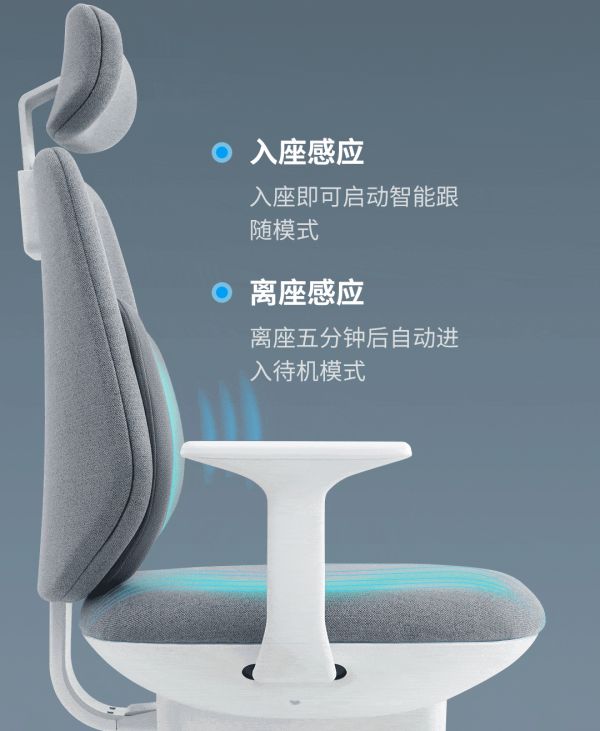 贝氪智能托腰办公椅的座部压力传感器会判别你的入座和离座状态,入座将自动开启智能随动模式,离座将进入待机状态。入座即启,离座即停,使用简单且节能省电。