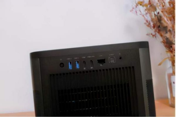 当贝投影F3的主要接口在机身背部,从左到右依次为电源接口、USB3.0×2、HDMI、HDMI(ARC)、LAN网口、S/PDIF以及3.5mm耳机孔。