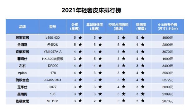 此次上榜的轻奢皮床,外观造型偏简约,以齐边设计为主,更符合目前中小户型的需求,空间利用率更高,价格在2000-5000元左右。综合价格及其他方面来对比,金海马、宜巢家居两大品牌性能、性价比更高,满足大部分消费者的需求。