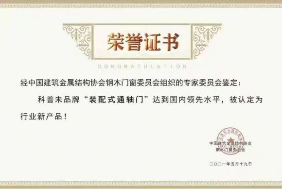 而一家叫科普未(上海)门窗有限公司,创新性的改变了门的结构,解决了户门下垂问题,能极致开合,防风、抗震等方面进行了极大提高。中国建筑金属结构协会钢木门窗委员会组织专家鉴定,“科普未”装配式通轴门达到国内领先水平,被认定为钢木门窗行业新产品。科普未也成为中国户门行业首家被鉴定为新产品的品牌。