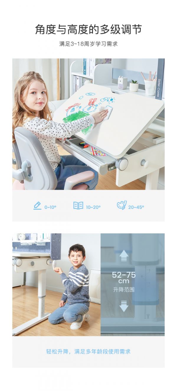 苏世博学习桌堪称可多角度、任意高度随心调整的“变形金刚”。比起传统的750mm书桌,尺寸固定,孩子容易近视驼背。而苏世博学习桌可实现52-75cm升降范围,手动把手快速调节&旋钮精准调节,双重调节精准精确,满足3-18岁多年龄段使用需求,呵护孩子脊椎健康。
