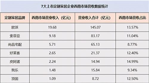 据财报数据显示,7大上市定制家居企业在西南市场的营收占比平均在12%左右,其中欧派近14%,索菲亚11%,尚品宅配近9%,好莱客12%,皮阿诺近15%,我乐近10%,顶固近13%,西南市场的营收占比份额不容小觑,同时也意味着仍有广阔的发展空间。另外,志邦在西南市场的增速达30%左右,其西南市场发展迅速。