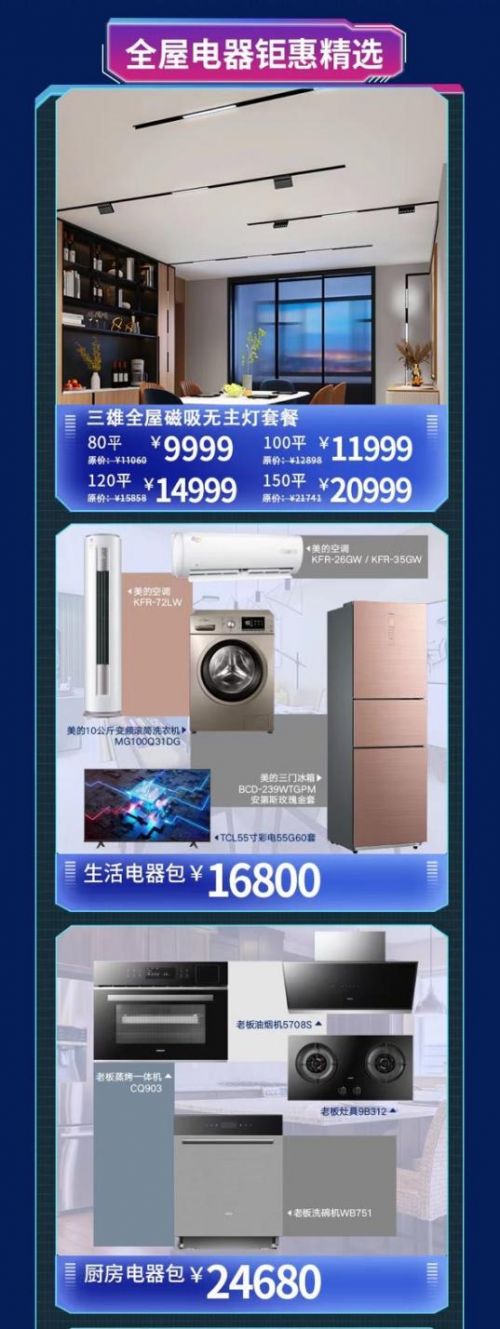 此次全屋电器节中,百安居精选了多款爆品、电器套餐和家居用品以供消费者选择,打造包括生活电器包、厨房电器包在内的钜惠套餐,覆盖全屋空间,分区域满足您的电器需求,可以根据家居面积和使用需求灵活选购,省钱省心又省力。