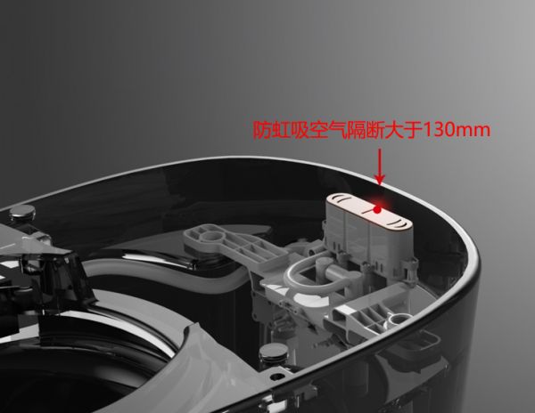 洛克斐智能马桶采用空气常开式防虹吸设计:当整机待机时,进水源与马桶污水之间设有130mm空气间隙,保证进水源与污水空气隔离,当马桶产生负压时,常开式空气间隙能够始终保持进水源与污水空气隔离,防止污水回流,保证进水源不受污染。
