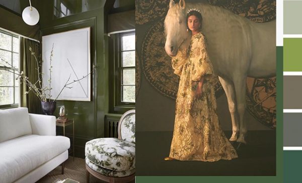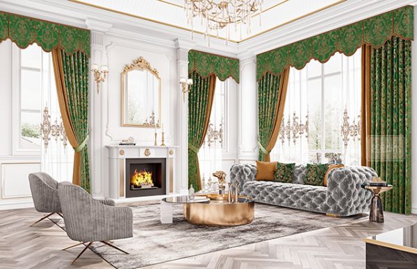 纤细的金色缠枝花纹仿佛蔓蔓青萝般绵延,成为房间中亮丽的风景,燃起了人们对华丽装饰和精致细节的热情。浓郁的雪松绿色为房间带来庄园般复古奢华的诗意氛围,使整体调性更加新鲜且充满活力。