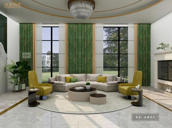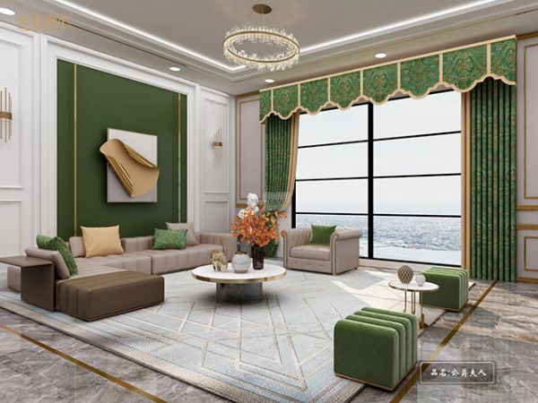 设计师通过大地色系与金色的搭配呼应了雪松绿色窗帘自然典雅的意蕴,线条洗练的家具与华丽金色细节,在平和端稳中,呈现出优雅雍容的气息。