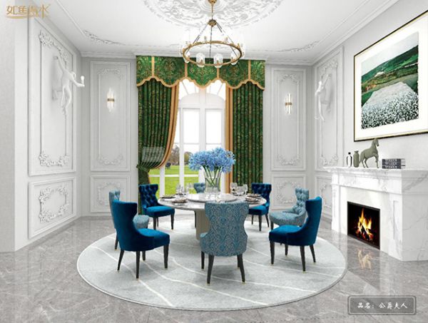 蓝白色凸显了雪松绿色的浓郁华美空间在古典与现代间获取了平衡。灰色地板使整个空间更加沉着稳定。