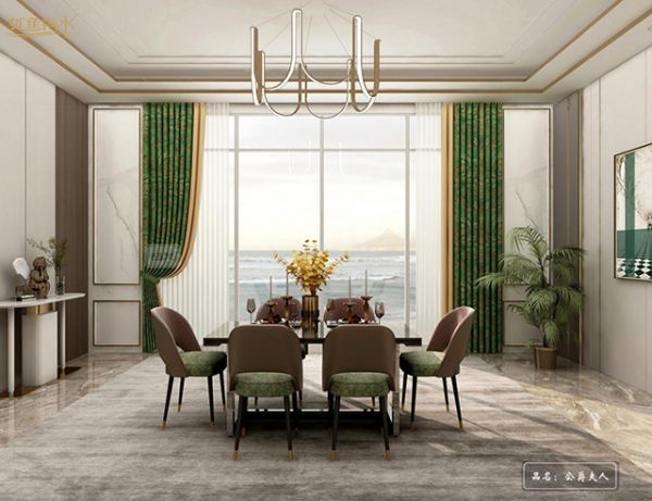 亮白色的融入,让空间色彩更加明快惬意,并突出了窗帘色彩诗意典雅。浓郁沉静的的色彩仿佛把大自然搬入家居空间,在充满田园气息的空间里就餐,犹如清风徐来,享受自然优雅的盛宴。