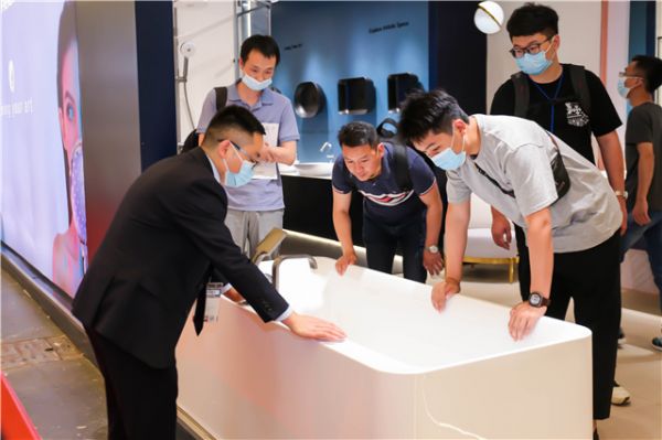 展会期间,FAENZA 法恩莎凭借优雅气质和艺术氛围感成功出圈。展会现场人员攒动,人潮汹涌所至,即为焦点所在。展馆内部采用开放式空间布局,透明的晶柱体设计,既如水流般灵动,又充满了迷宫般的梦幻,为人们提供了舒适又自由的观展体验。风格各异的产品空间刷新人们对卫浴生活的认知,引来参展者纷纷拍照打卡。