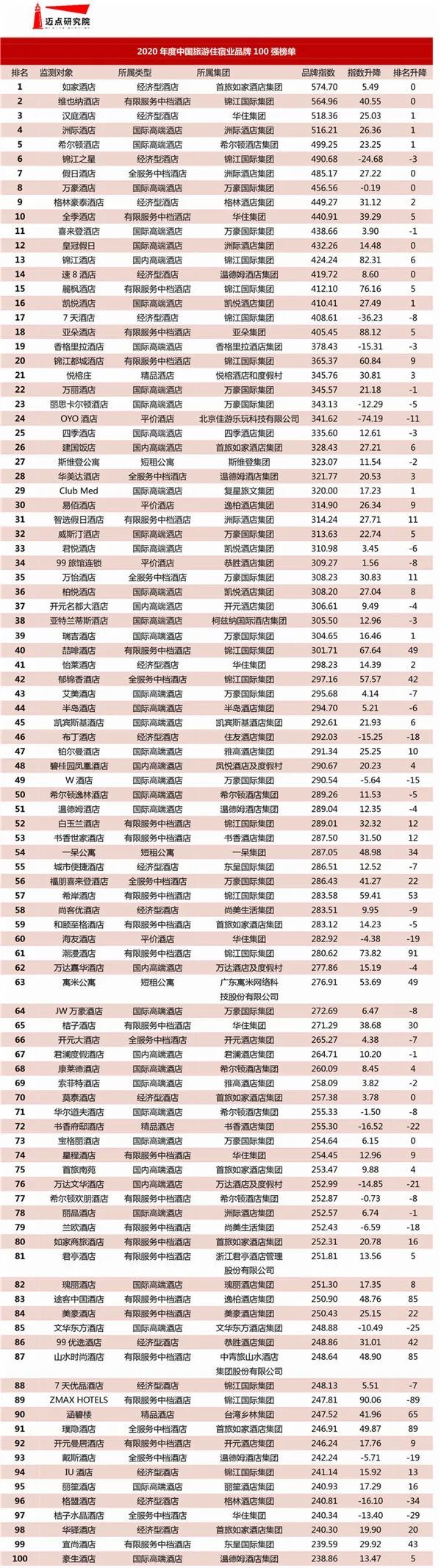 2020年度中国旅游住宿百强榜单