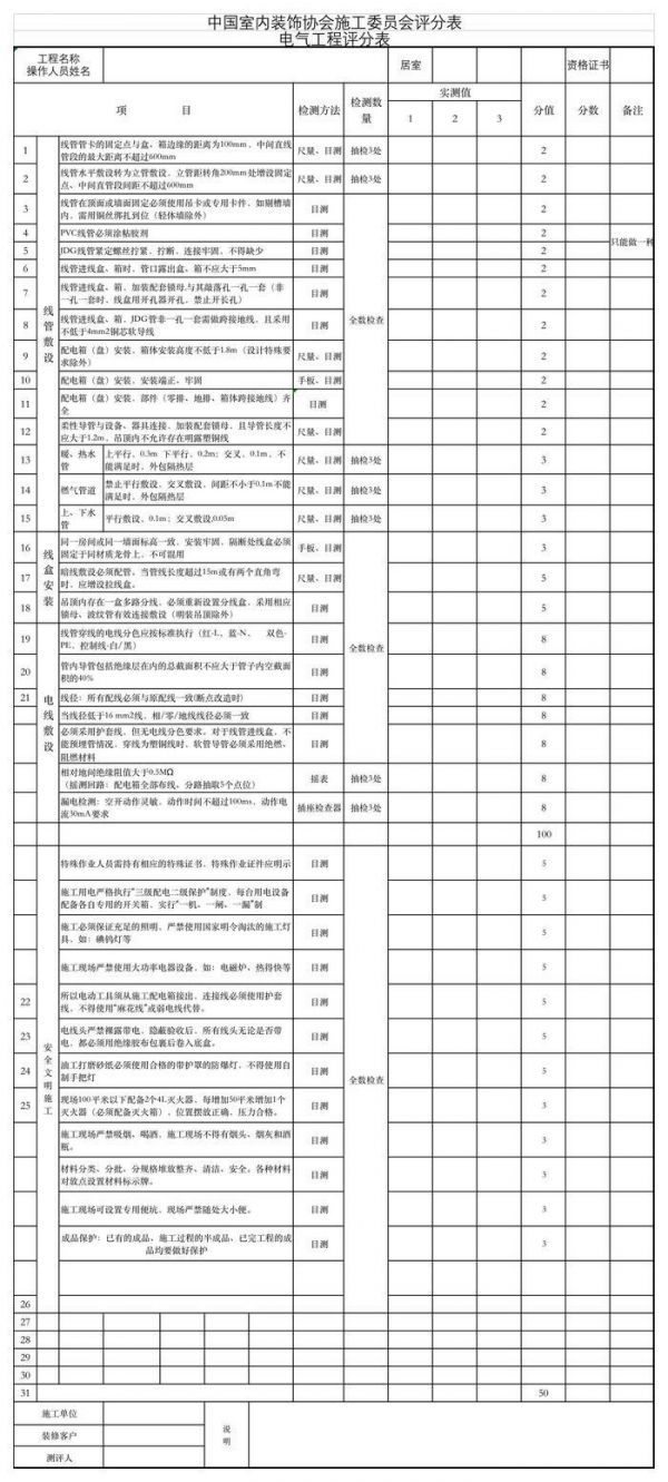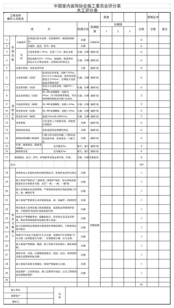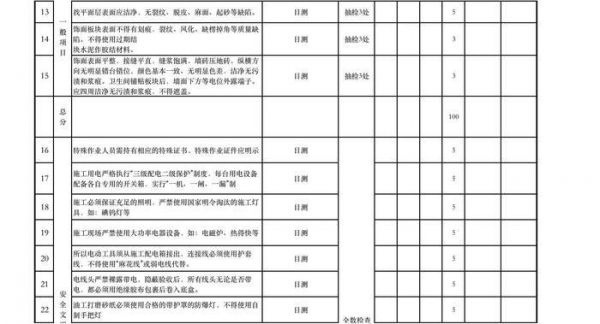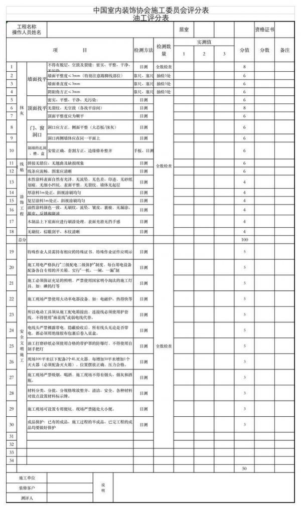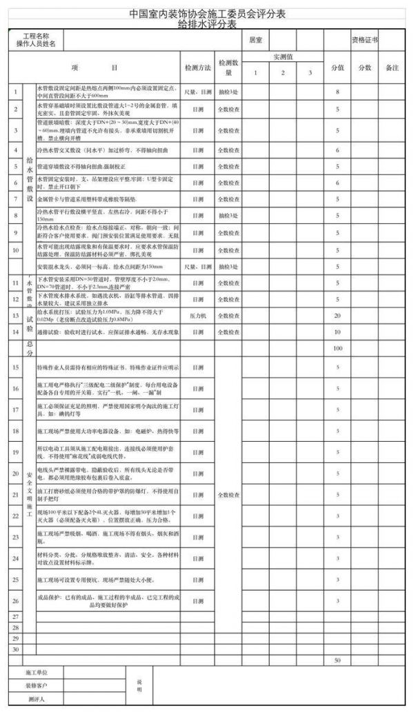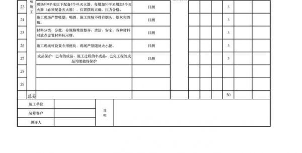 4、 分值:每个项目最少测量三处确定是否合格,合格满分,不合格零分。总分:填写实际分值,同时需分为专业总分,文明生产总分。