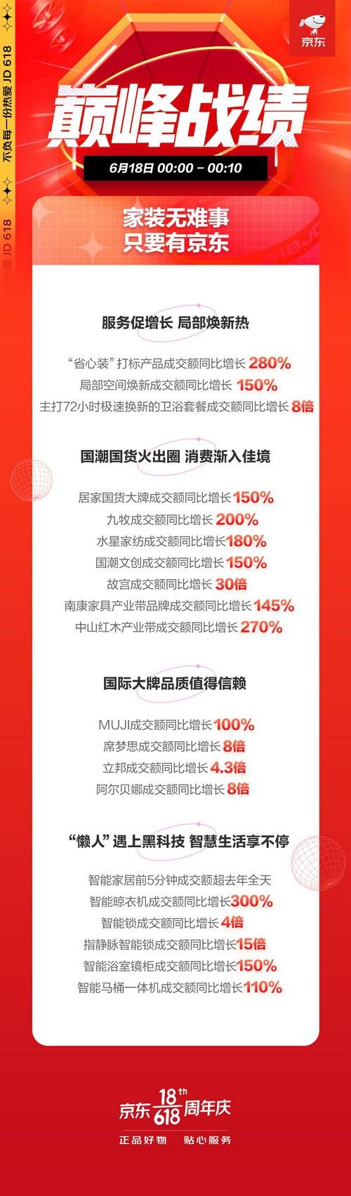 “时间到,赶快清空京东购物车!”6月18日零点刚过,在全民迫不及待的支付潮推动下,“京东618,18周年庆”迎来巅峰战绩,其中居家品类展现出超强爆发力,再次见证对家的无限热爱!