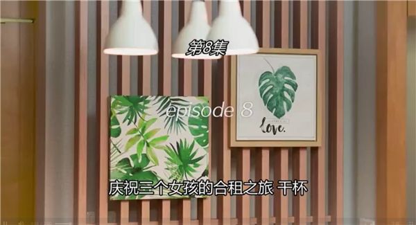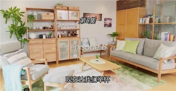 而小编的关注点在于:不愧是富二代的大房子!空间宽阔又分割得当,功能区划井井有条,整体家装风格清新自然且协调,简直是活生生的日式生活美学样板房。说到日式生活美学,很多人会想到极简主义的“断舍离”,或是令人赞叹的收纳巧思,又或是配合季节变换的饮食甚至衣着搭配。然而,在《48天》里我们还看到了一种追求整体协调的家装搭配风格,一种物尽其用又不为物所支配的态度。剧中家装色调以灰、白为主,间以自然植物元素,显得清新又整洁。比如下图中的餐桌与沙发都是结构坚固、造型简洁、细节体贴柔和的设计,采用原木色材质配以灰白主调的麻质坐垫和低饱和度的灰绿色抱枕。与沙发同风格的靠背休闲椅和脚凳也采用同款灰色坐垫,搭配在一起不显突兀,又很好地分割了客厅空间。同类风格的灰绿色地毯、壁画与房间内点缀的植物盆栽遥相呼应,令人感觉清新舒爽。