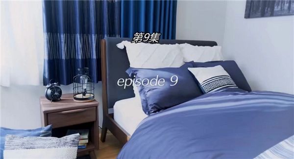 而男主角的卧室采用了更加沉着稳重的栗色家具和大面积藏青色与白色的床品,窗纱与窗帘的配色也与之相呼应,同时满足功能性与装饰性的需求。