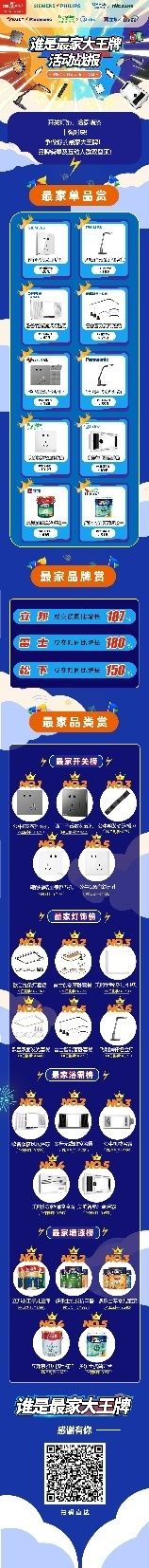 6月6日-6月20日,京东首期“谁是最家大王牌”动圆满收官,产品丰富,优惠多多,诚意满满。让我们期待下一次PK的到来,一起购买更多开关灯饰浴霸墙漆好物,焕新我们的新家吧,给家焕新活力吧~
