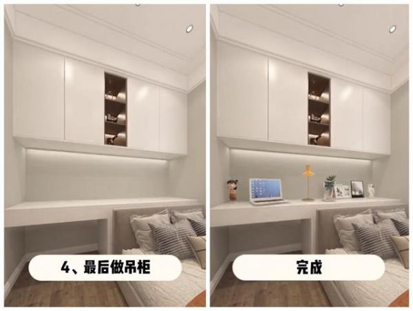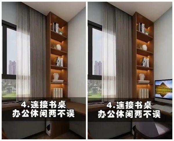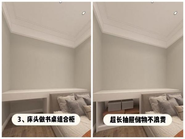 最后,在侧边连接书桌,形成卧室办公区,当然也可以灵活运用,当作梳妆台之类的,完全没问题,至此,一个五六平米的小方形卧室就设计完成了,要比榻榻米式的设计方案实用得多。