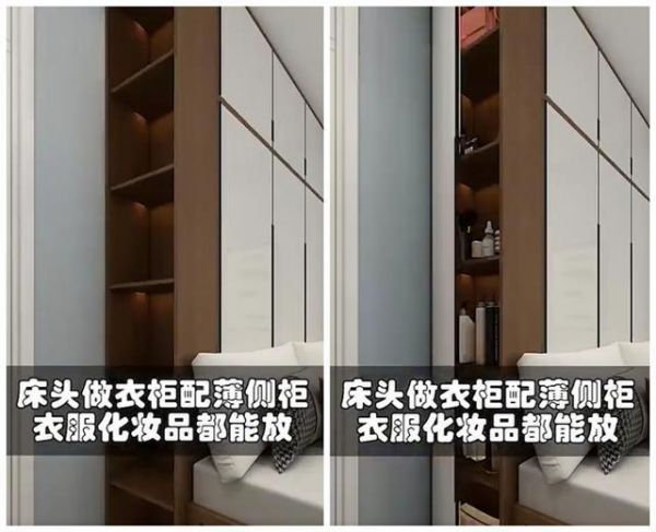 而床头,也可以用缝隙空间做出侧柜,当作卧室衣柜使用,当然,侧边如果有冗余空间的话也别浪费,做侧柜还可以收纳包包、化妆品等小件杂物~
