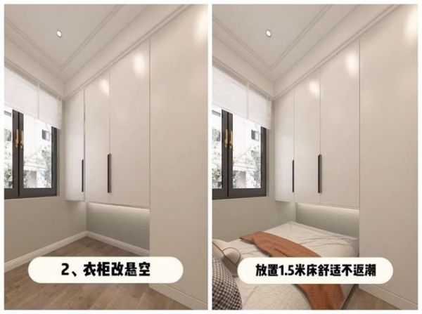 做好通顶的整面墙衣柜后,可以将衣柜改成悬空式设计,利用靠窗的位置放下整张床,充分利用起每一寸空间。