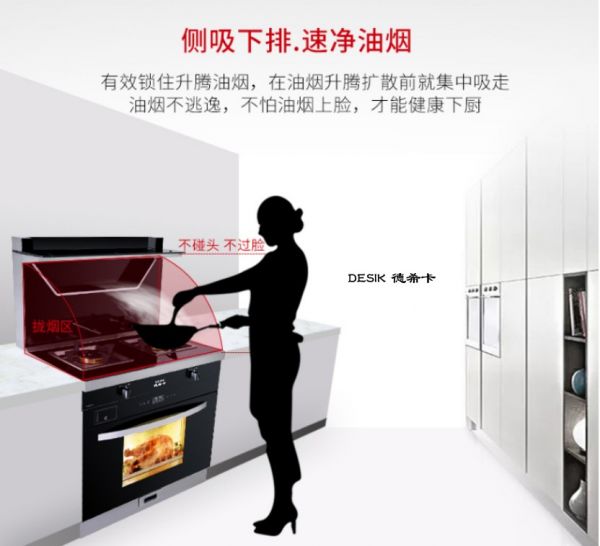 根据奥维云网最新数据显示,国内目前接近70%左右的房子,厨房面积不超过8平米,如此小的面积,逼迫用户把厨房做成开放式,而开放式厨房最大的问题就是油烟。如果油烟吸不干净,会导致油烟扩散到餐厅客厅甚至卧室里,整个家都充满了油烟味!所以用户在选择集成灶的时候一定要选择大吸力的集成灶。像德希卡集成灶采用了烟灶智能联动功能,运用微空气动力学原理,使油烟瞬间消失于无形,内部电机高速运转,产生超大风压,结合侧吸下排方式,再大油烟也会在短时间内被吸得一干二净,油烟净化率高达99.96%,有效防止了油烟扩散对人的健康以及厨房环境的污染,使开放式厨房成为可能。