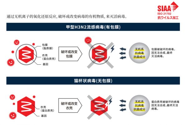 本次朝日木泰科研发的抗病毒天然木材地板,针对有包膜病毒和无包膜病毒,通过在表面涂层采用无机系抗病毒剂,利用无机离子的氧化还原反应,来破坏或改变病毒的有机物,从而达到灭活病毒的效果。特别对甲型H3N2流感病毒和猫杯状病毒功效显著。