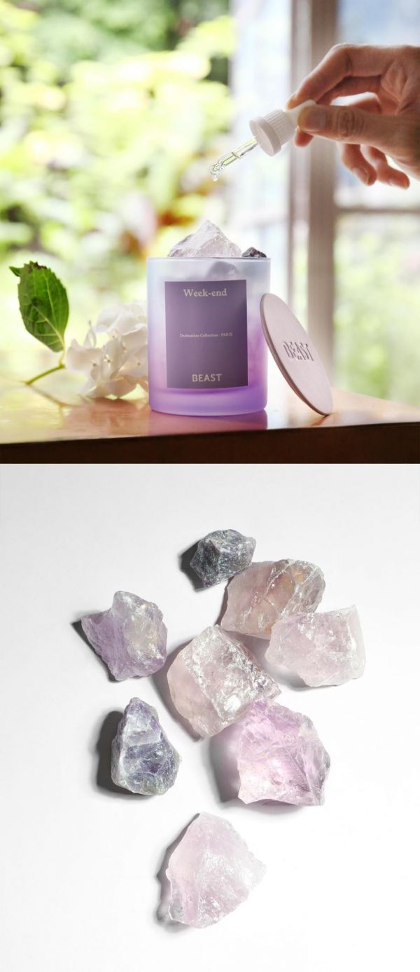 晶石渐变的磨砂玻璃罐是2021流行色香芋紫,优雅中透着浪漫气息,散发无限魅力。晶莹剔透的巴西紫水晶深浅交错,滴入精油,深紫色水晶舒缓情绪,透紫色水晶利于广结人缘。
