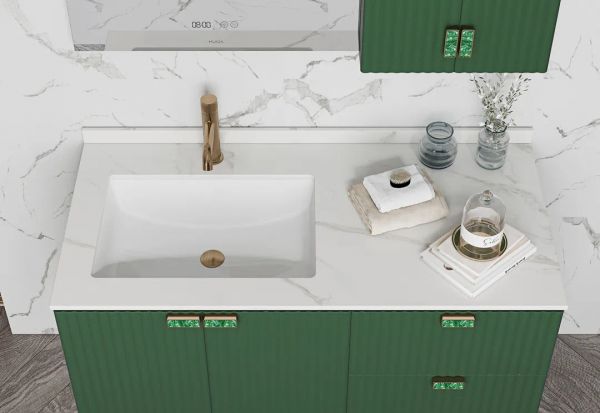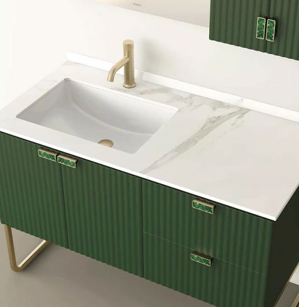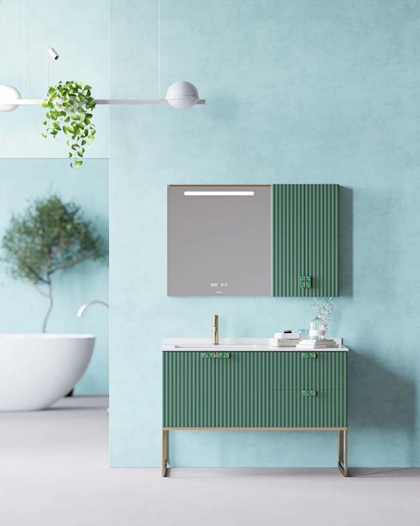“轻奢”代表了对生活品质和精致细节的追求,当轻奢元素与浴室空间相遇,又会碰撞出怎样的火花?惠达轻奢浴室柜主体采用墨绿色设计,简洁大气,极具视觉张力;搭配轻巧亮金色柜腿和硬朗的金色龙头,形成鲜明的色彩对比,彰显产品优雅格调,更给人耳目一新的感觉。
