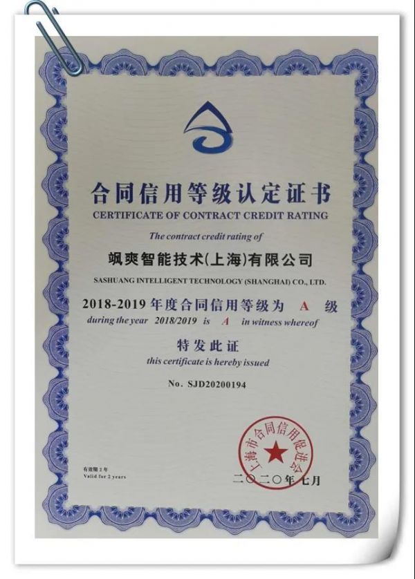 近日,经上海市合同信用促进会严格评估,在2018-2019年度企业合同信用等级评价和“守合同重信用”企业认定活动中,飒爽智能技术(上海)有限公司信用等级被评为A级,并被授予“2018-2019年度上海市守合同重信用企业”荣誉称号。