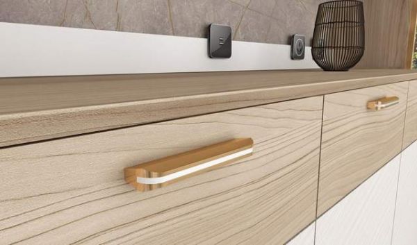 “北欧物语”系列产品的拉手设计灵感来源于钻石,在切割面交汇出完美的几何线条,既精致又简约。在拉手顶部开槽,嵌入白色长条作为点缀,丰富整体造型。抽面拉手采用内嵌式设计,结构上更加合理,以金色和白色的配色更符合产品的调性。