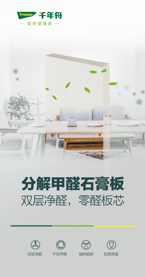 优质净醛板材则将环保板材的特性与净醛功能相结合,例如千年舟旗下分解甲醛石膏板,采用本身不添加甲醛的优质石膏板芯和优质原木护面纸,同时能够强效吸附甲醛并进行不可逆分解。不仅无醛,还能除醛。此外,分解甲醛石膏板拥有优异的物理性能,蜂窝发泡结构,轻质高强;防火阻燃,配合轻钢龙骨可实现A级防火阻燃然要求;空腔结构,孔结构分布适当均匀,还能保温隔音。