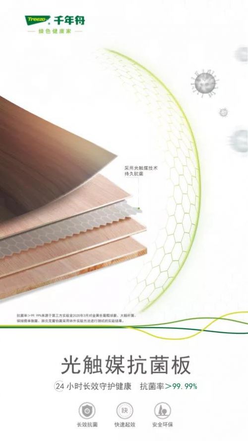 三看品牌,大品牌用料讲究,技术一流,工艺精细,还有国际化智能设备背书,加之完善、专业的服务体系,生产的净醛板材品质及服务更有保障。例如针对抗菌抑菌、健康环保的需求推出的触媒抗菌板,以千年舟细木工板等为基板,应用新一代纳米光触媒技术,高效降解甲醛、苯类、氨、TVOC等各种污染物,还可有效抑制、分解金黄色葡萄球菌、大肠杆菌、铜绿假单胞菌、肺炎克雷伯菌,抗菌率均可达99.99%。