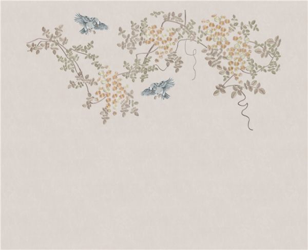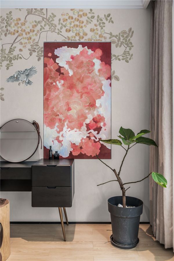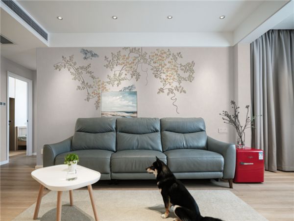 客厅枝叶载罗兰的藕粉色墙布与墨灰色沙发,营造出足够的自然感和恬静感。