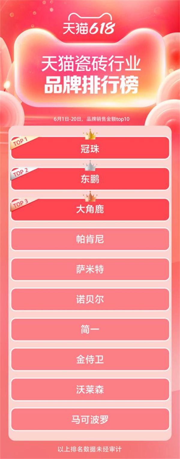 天猫“6.18”瓷砖品牌排行榜,大角鹿销量排名第三!