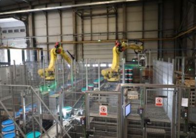 易呱平、墙尼等袋装产品的生产流程从包装袋准备开始,经过产品灌装、智能码垛、整形压实,顶部一次覆膜、翻垛和二次套模,最后成垛仓储,等待出库。墙锢等桶装产品的生产则包括全自动上桶、乳液灌装、桶盖密封、桶身定位、机械臂码垛、热塑包装机覆膜。并且产品都具有四码关联,扫描二维码就能轻松溯源防伪。以上整个生产过程都不需要人工参与,完全由机器单独完成。