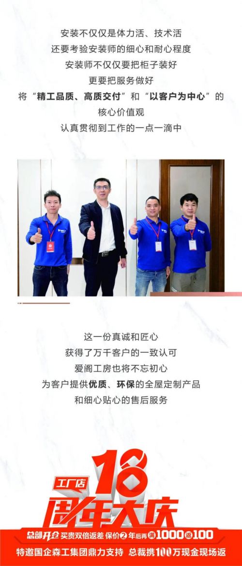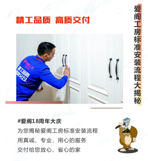 十八年品牌发展,爱阁工房认真践行价值观和品牌宣言,广受客户好评!尤其是安装环节,更是屡屡获赞。今天来同大家一起揭秘爱阁工房标准安装流程,看看何为“精工品质、高质交付”。