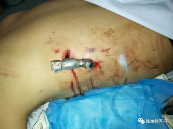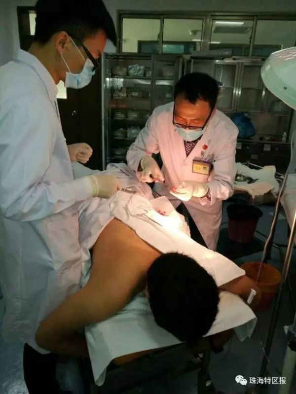 珠海市中西医结合医院心胸外科医生薛瑞会诊后,发现这个伤口深达5公分。在麻醉科和手术室的配合下,薛瑞先为李先生清洗伤口周围污迹及消毒,接着扩大伤口取出断开的水龙头。